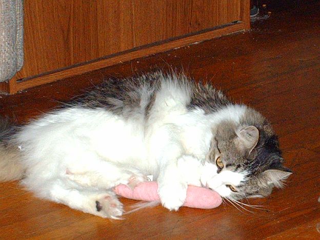 Being told that it looks like my furball Lou is playing with a vibrator in this picture. It's actually a pink catnip stoagie that he stole from the girls.