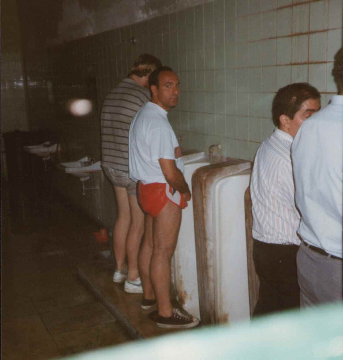 The other time was in Lissabon in Portugal. At the railwaystation I had to go to the toilet. There had been three oldfashioned urinals with low walls against sideviews. There was a man standing already at the middle box. When I stood there pissing I noticed that instead of pissing the man rubbed his hard tool. Probably it was a gay waiting for contacts or interesting views.