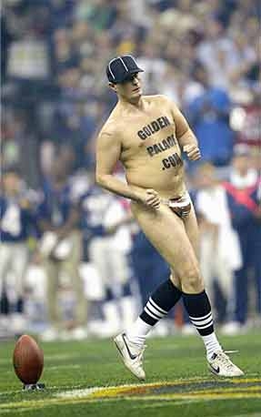 February 1, 2004, Houston, USA--In an unconventional display of high-visibility marketing, notorious British streaker Mark Roberts pulled off his first successful North American streak at Super Bowl XXXVIII while displaying the Internet address "GoldenPalace.com" as a Henna tattoo on his bare chest and back.