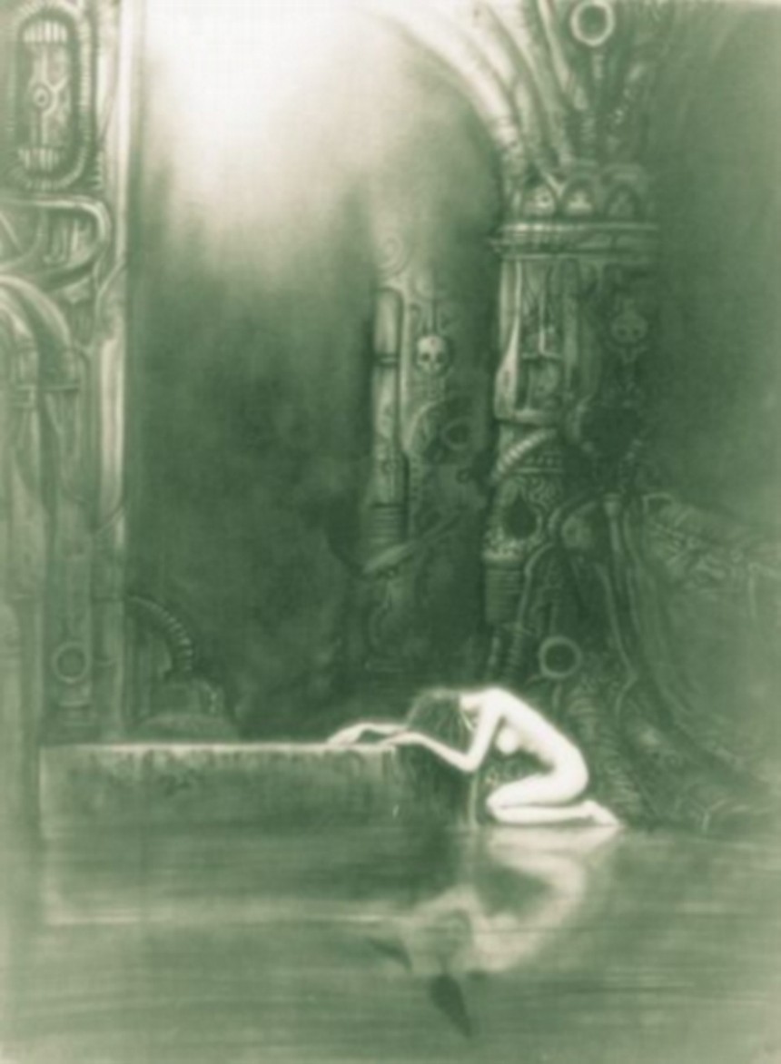 Lil, I believe that's some of H.R. Geiger's work. Was just looking at a book on him at Borders the other day...almost positive I saw that painting in the book.