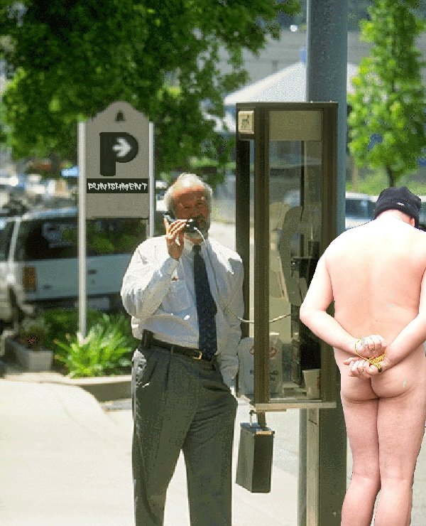 I was pushed violently towards the door, only prevented from falling by the fact that someone had hold of my elbow restraint. I was bundled out into the street and was shocked to see a small crowd of neighbours watching. When they saw that I was naked from the waist down they booed and I felt a lump of mud hit me just above the eyebrow. A second splattered against my shirt. When a third hit my privates there was a cheer. Before I knew it I was lying face upwards in the back of a van – the girl with long hair leaned over and attached my elbow restraint to a short chain just behind the driver’s seat. She then shuffled over me, grasped my right ankle and tugged it towards one corner where I felt it being cuffed – she repeated the process with my left ankle. I realised that I was lying spread-eagled in the van at the same moment that I saw that the windows were filled with the faces of the on-lookers.