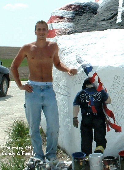 I'm told that there is a huge rock near a gravel pit on Hwy.25 in rural Iowa. For generations, kids have painted slogans, names, and obscenities on this rock, changing it's character many times. A few months back, the rock received it's latest paint job, and since then it has been left completely undisturbed. It's quite an impressive sight. Be sure to check out the multiple photos (all angles) of the rock. I thought the flag was draped over the rock, but it's not. It's actually painted on the rock too.