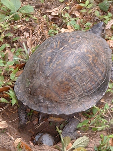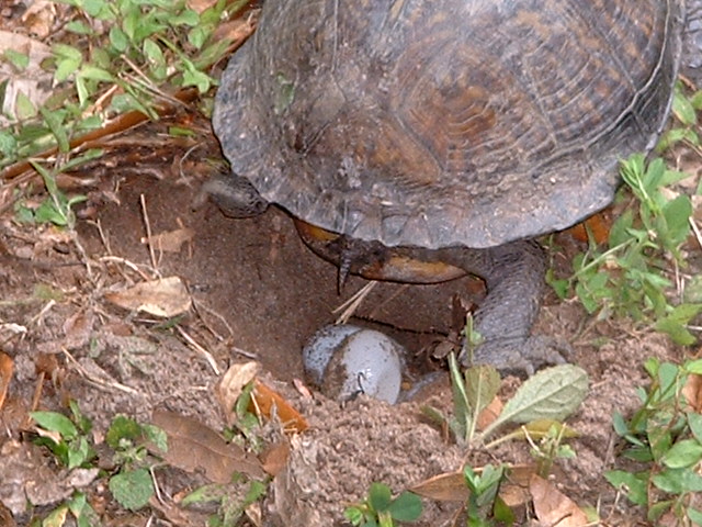 Kiddo came running in, "mom you got to see this" (does anyone remember the 4 foot iguana he found?) so I run/creep out there to find her digging a hole across the street. The house is vacant but owned. Supposedly it takes 3 months to hatch and the likelihood is that the raccoons will get to them first.