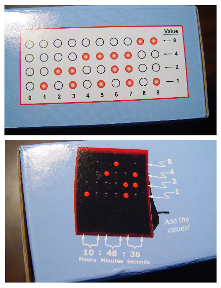 It's only true binary if you take each column separately. It can be set up to read correct binary hr., min., sec., using only the bottom three horizontal rows.