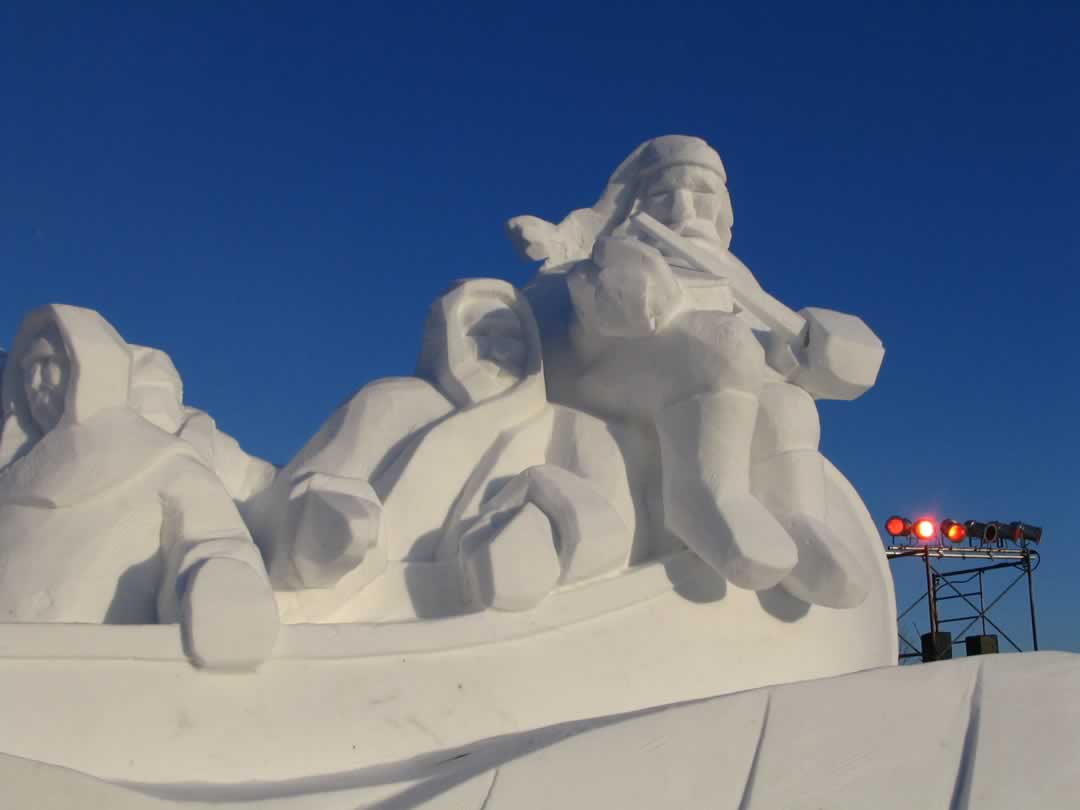 I live in a place that is cold and snowy. But that does not slow us down. In the dead of winter we have a festival here that celebrates Winter. It is called 'Le Festival du Voyageur'. It is held in our French area, celebrating 'Le Voyageur', or the fur trader. All around the site are these snow carvings. The canoe sculpture is about 40 ft long and 15+ ft high. The other sculpture is of Cindy Klassen ( 5 metals in the last winter Olympics, who is from here), with some heads of the Plains Bison. The temperature here today was -20c or -4f.