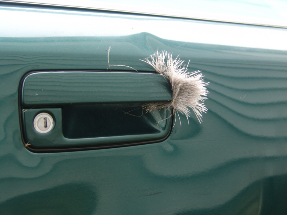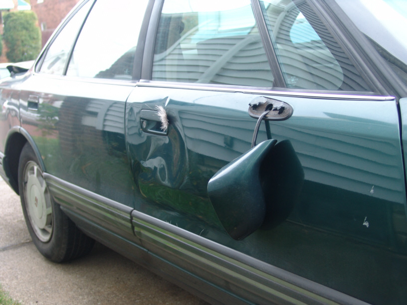 With the cars suddenly stopped, I pulled over and got out to see the damage wasn't really that bad. All the damage was confined to the front passenger door, not a scratch in front of or behind it.  Mirror torn off, door dented and calling card stuck under the door handle, ….. and considering I was hit by a deer, it was really very little when knowing what damage CAN be done by such a collision.