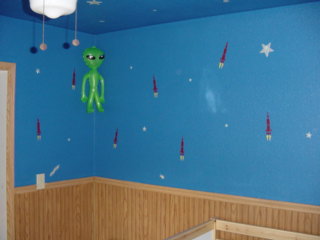 Looks like the alien is on the end of a fan blade. When you turn it on and it flies off and jumps into his crib, that should scare the hell out of him.