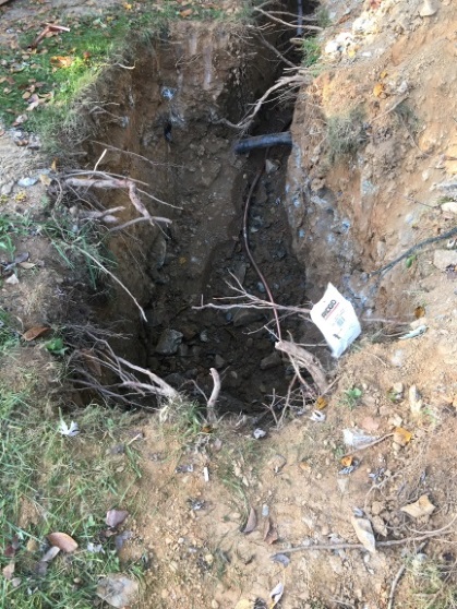 Then the plumbers got to dig their own hole, resulting in a huge pile of dirt. Note in both "dirt" piles, the number and size of rocks: