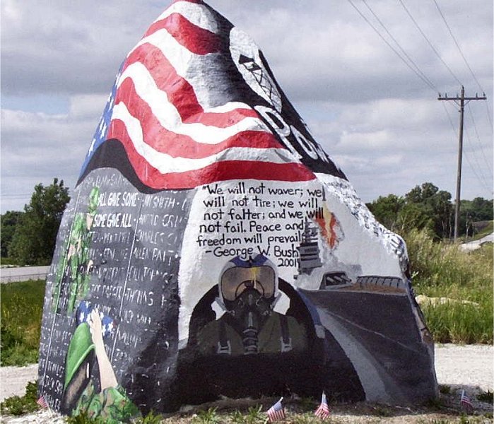 I'm told that there is a huge rock near a gravel pit on Hwy.25 in rural Iowa. For generations, kids have painted slogans, names, and obscenities on this rock, changing it's character many times. A few months back, the rock received it's latest paint job, and since then it has been left completely undisturbed. It's quite an impressive sight. Be sure to check out the multiple photos (all angles) of the rock. I thought the flag was draped over the rock, but it's not. It's actually painted on the rock too.