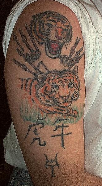 This is my other (right) arm . . the two tigers are "standard" inks, but messed around with a bit and the bamboo & grass etc. added in by the artist (Phil) . . . of the writing - that was done later. . . the top two words (and apologies to any Chinese ladies/gentlemen if it's wrong!) say "Year of the Tiger", which is my birth-year;- the bottom one is just made up (I hope!!!) by me, and is a joining together of the symbols for Pisces and Aries, which are mine & my very best (female) friend. . . we are VERY close (but not sexual) freinds, and it seemed the right thing to have a permanent reminder!!