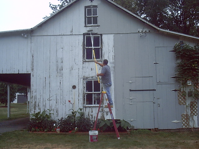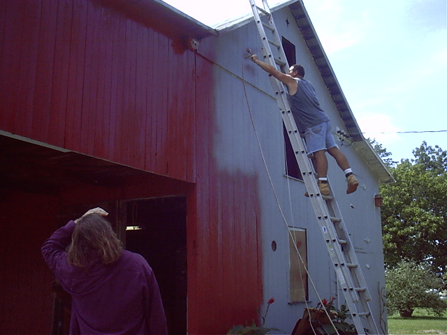 Oh, I hate that ladder! But the barn is huge! No other way to reach it.........That's a friend on the ground pacing and every now and then running to hold the ladder!