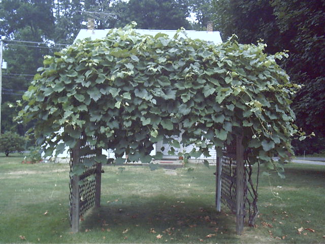 I do think that is a grape vine huntersgirl! Here's a pic of mine to compare the leaves to. Mine must be over 30 years old. They only fruit after five years and need lots of sun (all day sun). Mine is a concord grape. There are several varieties.