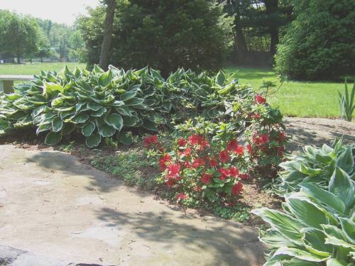 TY for the mulch suggestion jay-t! I have a mulch of pine needles on them now. Here's a pic of the existing azealas in my back and side gardens. I haven't taken any of the new ones up front yet. You can see that the hosta are bigger than the azeala. The hosta love this spot...but I'm thinking the azeala don't care for it at all! I'm doing my best to ammend the soil for them and just let them go this season and see what happens.