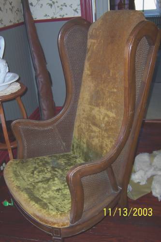 Here's one of the wing back chirs my mother-in-law gave me (I have a pair). This is it in it's original state...never been worked on...around since the dawn of lime green velvet textile. So, you see why I had to reupholster it...eh?