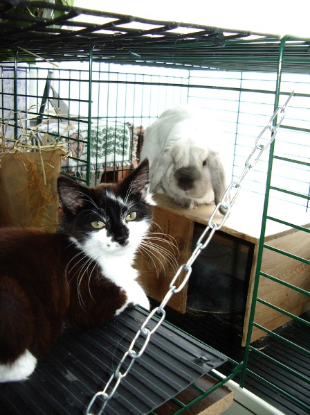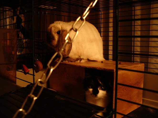 When Lake is away on business for a few days, he gets my parents to take care of Vinci, our kitty. My parents have an adorable bunny, Chatouil. While at first, the cat and the bunny didn't want anything to do with one another, Vinci is now starting to realize that he is getting bigger than the bunny. And he is soooooooo curious about that rabbit!!! Sorry about the third pic being so dark... Vinci would wait until the rabbit peeked over the edge of his little house to give him a tap on the nose!