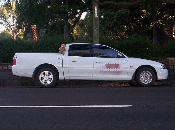 Henry on the back of the ute (Holden Crewman)