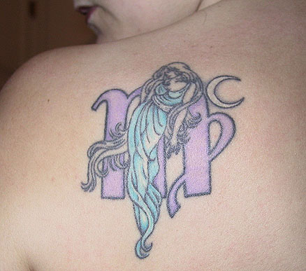 I'm a Virgo, so this is me! Done 7.5 years ago, by Painless Ric in Camas, WA...one of the few professional tattoo artists who has no ink of his own! He's pretty good for a nakedskin guy though  He was also my piercist. (Is that a word?)