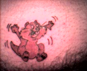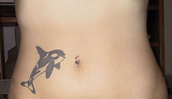 My crappy one...damn me for letting a half-assed scratcher touch me! Ah well, I was younger and stupid then...sheesh. Someday I'll have it covered up, but it tickled so much here! I actually have a full belly piece dreamed up, dunno if I'll ever go through with it though. If so, this one will be modified to an Athabascan style orca, with an Athabascan heron on the other side of the navel, with tribal twining between the two...my totem animals.