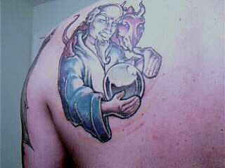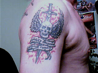 The first tat I got is on my hip. It's from an album cover of a group called PWEI (Pop will eat itself). I just really enjoyed the design. I got it on my hip because I wanted one just for me (and apparently you at Pixies... and people at bars when I get really drunk. don't ask)