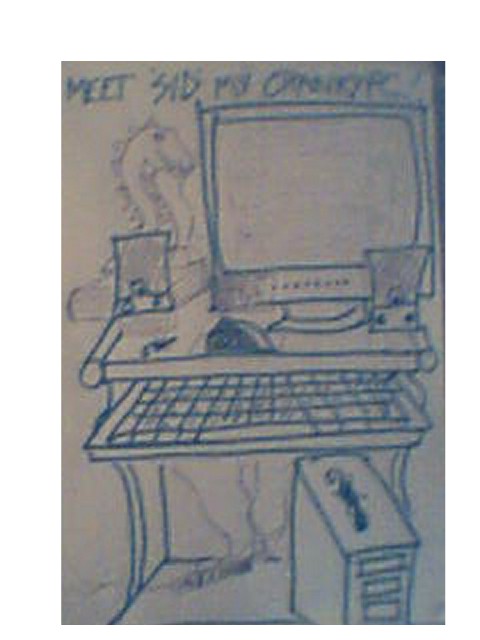 here is a quick sketch of "Sid" my PC. The title on the top of the page says, "Meet Sid, My cranky PC" He resides on my desk.