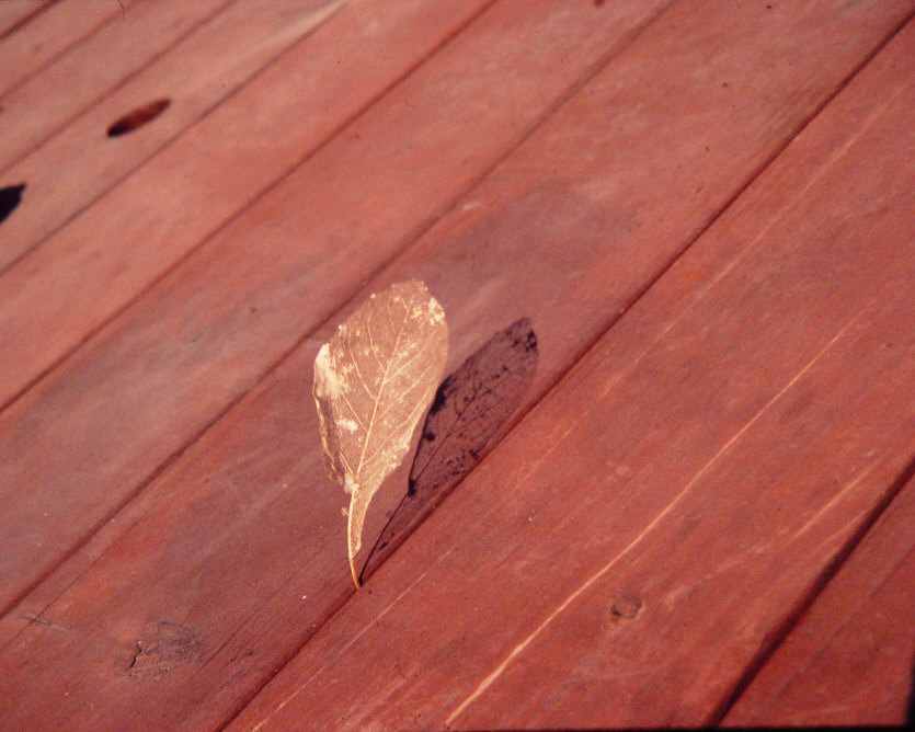 Here is the leaf stuck in the crack of my patio table. I thought it a bit unique with the total, almost complete hollow, leaf intact.