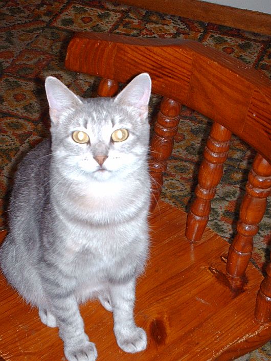 Anyway, I did keep one kitten from each litter. From the first litter I kept the little all gray one, Lil says she's a Russian Blue. Her name is Dominique.