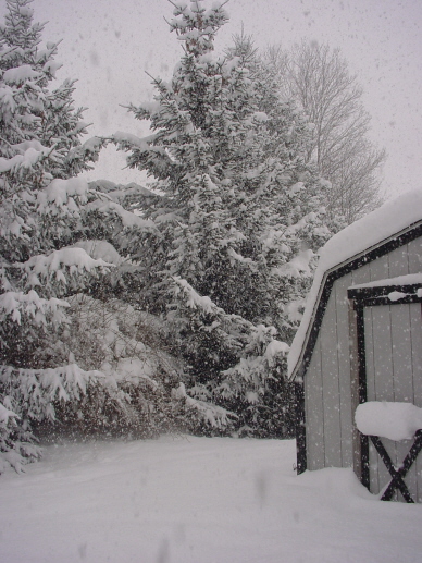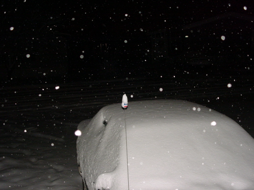 A few snow pics here fisrt and last are of the snow cap on the ball on soda's car the middle 3 are of the trees out back.